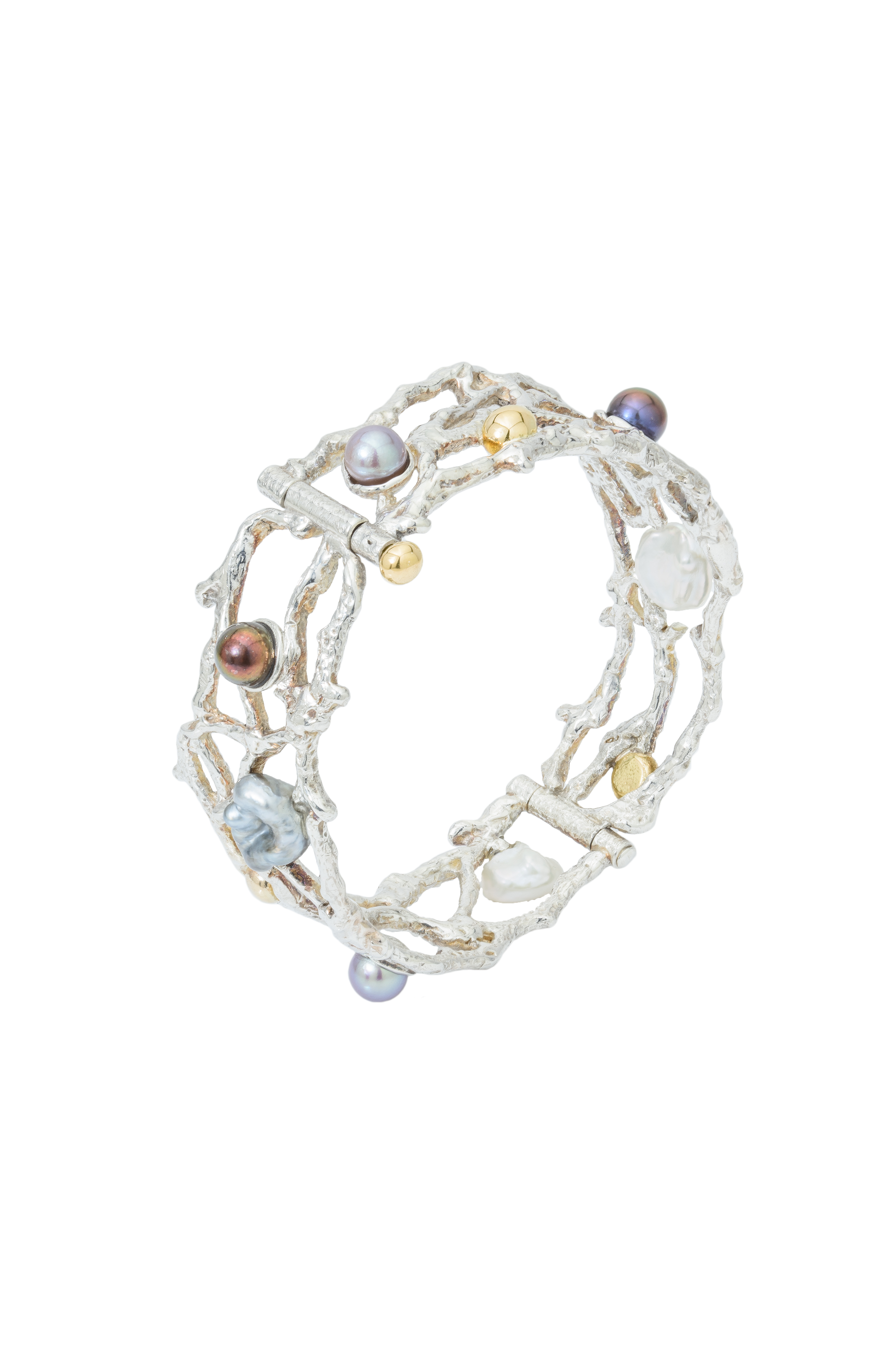 armbåndet med perler, der synes at hviske havets hemmeligheder. Blågrå Tahiti keshi-perler, hvide ferskvands keshi og de